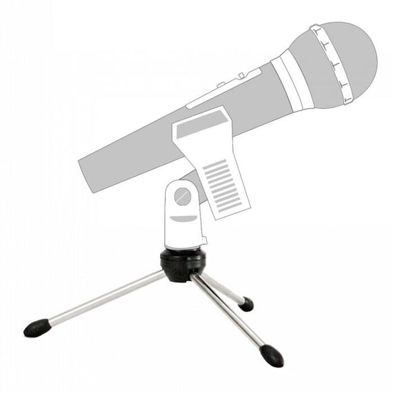 Mini tripie de posición en mesa para micrófono, metálico y cromado.