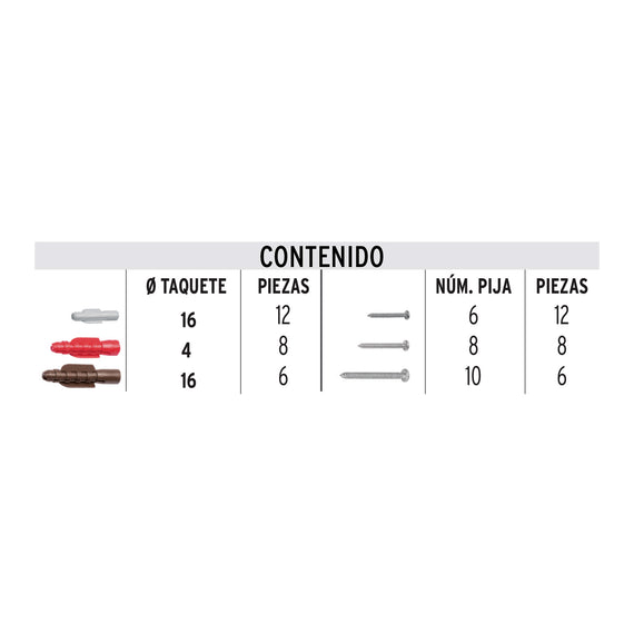 Estuche 26 taquetes 3/16", 1/4", 5/16", c/pijas #6, #8, #10 fiero TQ-26J