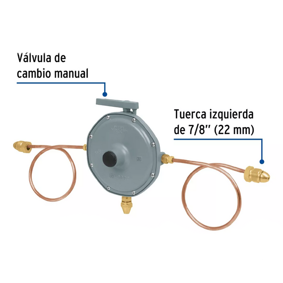 Su diseño incluye una válvula de cambio manual y viene equipado con 2 pigtail con tuerca izquierda, niple terminal y tuerca cónica de latón, lo que facilita su instalación y asegura una conexión segura.