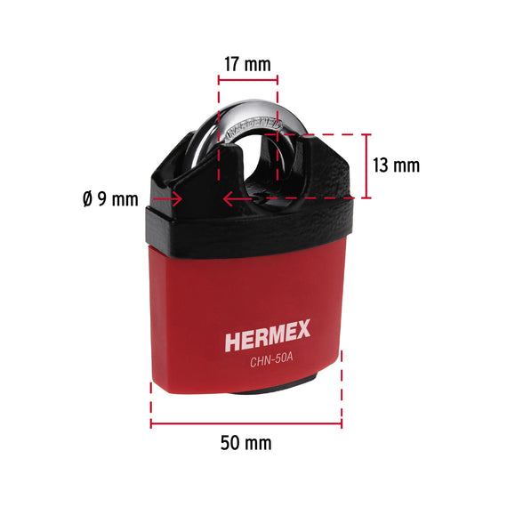 Candado de hierro 50 mm gancho protegido, llave anti-ganzúa HERMEX CHN-50A