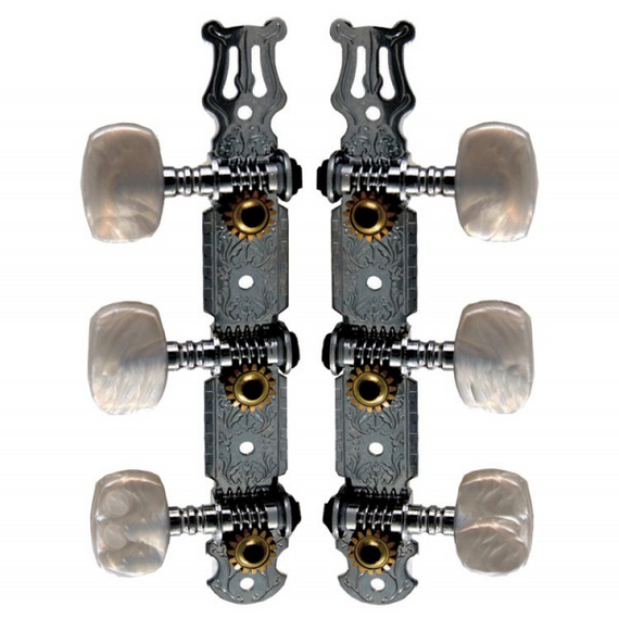 Clavijeros para guitarra clasica Jendrix MH-3N. Son el repuesto ideal con el que dar un lavado de cara a nuestra vieja guitarra y conseguir que esta luzca como nueva con una afinación impecable. Con mariposas nacaradas y acabado cromado, además de un elegante acabado clásico en forma de lira, estos clavijeros son el complemento perfecto para tu guitarra clásica.