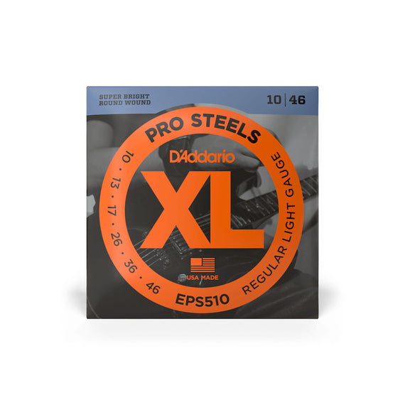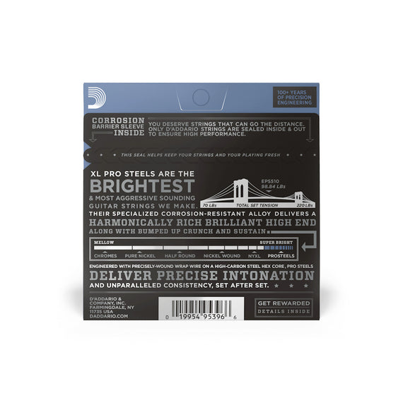 Las cuerdas EPS510 ofrecen un tono súper brillante y crujiente, y resistencia a la corrosión para una mayor vida útil de la cuerda. La serie XL ProSteels de D'Addario utiliza una aleación de acero resistente a la corrosión altamente magnética que proporciona un tono súper brillante sin sobretonos estridentes. Ofrecen una gama de agudos harmónicamente abundantes y brillantemente penetrantes combinados con graves pronunciados, ajustados y duros. Si busca más crujido, agarre y efecto sostenido, ProSteels es la opción para usted. D'Addario es la marca de cuerdas para instrumento más vendida del mundo. Sus productos son el resultado de más de un siglo de investigación y desarrollo y son instaladas como equipo de serie en las mejores marcas de instrumentos. La pureza de sus materiales y la maquinaria de alta tecnología empleadas en la fabricación de sus productos hacen de D'Addario la marca preferida por los músicos más relevantes de la actualidad. Todas las encordaduras D'Addario vienen en empaques sellados con un gas especial que previene la corrosión y son amigables con el medio ambiente.