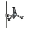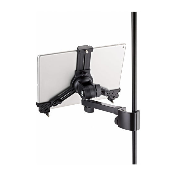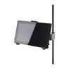 Soporte universal para tableta para diferentes modelos. El soporte universal para tableta se puede ajustar de forma variable para adaptarse a diferentes tamaños de tableta sin necesidad de herramientas y sostiene los dispositivos de forma segura y eficaz para muchas situaciones diferentes. Ya sea en el escenario, en las salas de ensayo o en casa, gracias al fuerte elemento de sujeción con el tornillo de sujeción ergonómico, el soporte se puede acoplar a cualquier tubo de hasta 30 mm de forma rápida y sencilla. Los brazos de soporte ajustables individualmente pueden adaptarse al uso de tabletas con una altura de 222 a 334 mm y un ancho de 128 a 232 mm (por ejemplo, iPad, iPad Air, iPad Pro, Amazon Fire HDX 8.9, Samsung Galaxy Tab de 9.7, Google Nexus 9, Asus Transformer o Microsoft Surface, así como Surface Pro). La profundidad de las tabletas puede variar entre 6 y 11 mm. Para el primer uso del soporte para tableta, la configuración de los brazos de soporte se realiza ajustando los tornillos de sujeción al tamaño y profundidad de la tableta. Para otros usos, la tableta se puede conectar y desconectar de forma rápida y sencilla mediante un cierre a presión. Una práctica tuerca de mariposa permite ajustar el ángulo, de modo que cada usuario pueda encontrar fácilmente su posición individual ideal. La tableta puede cambiar entre las posiciones vertical y horizontal. La tableta se mantiene en su lugar, no hay peligro de que la tableta cambie de posición por sí sola.