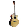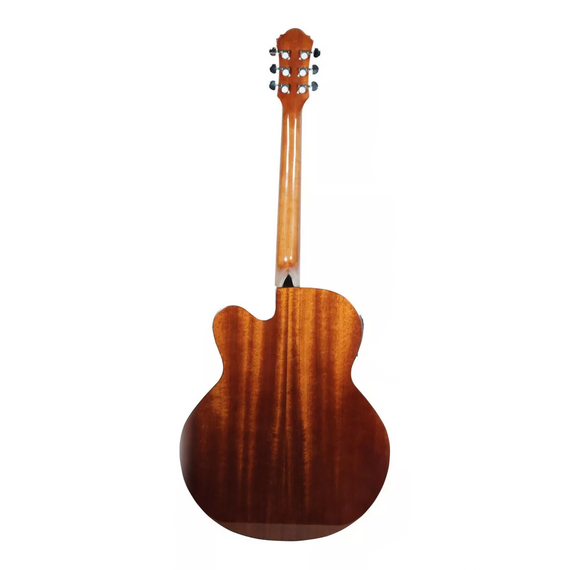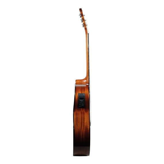 Guitarra electroacústica jumbo, tapa de abeto, aros, fondo y brazo de caoba, puente de sonokelin y diapasón de rosewood, resaque, mica, 20 trastes, maquinaria de acero die-cast, preamp activo KLT-34 con afinador digital, ecualizador de 4 bandas, volumen y fase, equipada con cuerdas D’Addario