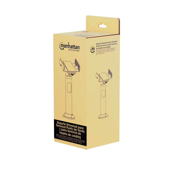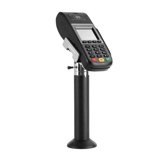 Soporte seguro antirrobo y abrazadera ajustable para terminales punto de venta (lectores de tarjetas) con ancho entre 69 a 109 mm, Inclinación de +60 a -70°, giro de 360°, aluminio, negro