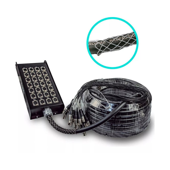 Cuenta con 16 entradas XLR y 4 salidas XLR y tiene una longitud de 30 metros. Conectores de nylon de alta calidad
