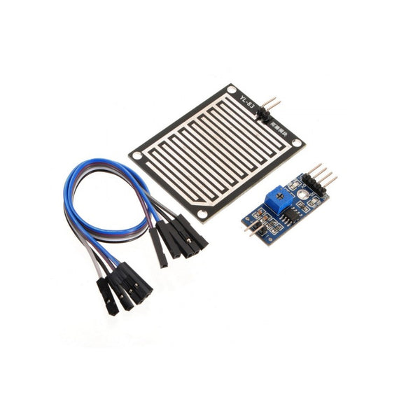 • Este sensor te permite saber si está lloviendo o nevando. El sensor posee 2 electrodos separados por una distancia muy pequeña, cuando llueve las gotas de agua cierran el circuito entre los 2 electrodos y permiten el paso de una pequeña corriente. Este cambio de voltaje es detectado por un OpAmp en modo comparador.