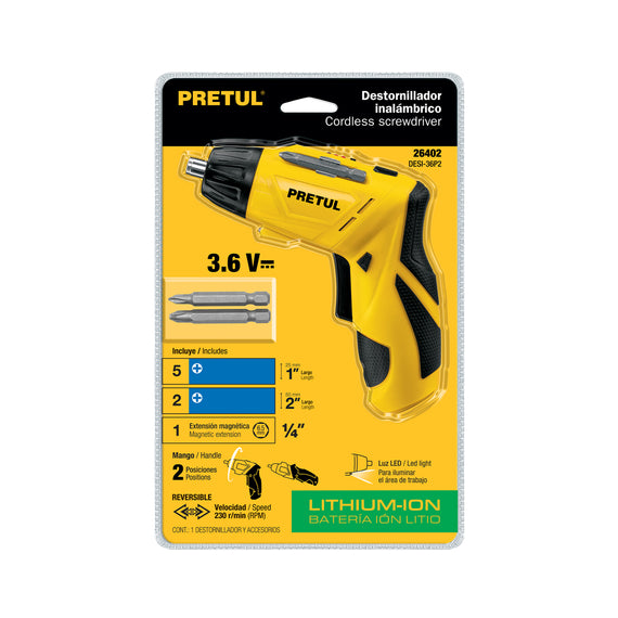 Destornillador inalámbrico de dos posiciones, 3.6V, PRETUL