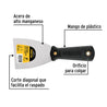 Acero de alto manganeso con alta resistencia al desgaste Corte diagonal que facilita el raspado Mango de plástico Hoja a todo lo largo del mango para máxima resistencia Para resanar y aplicar pastas