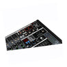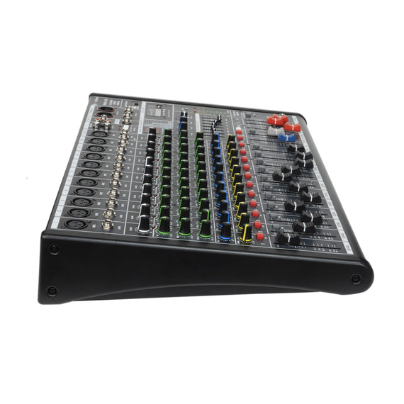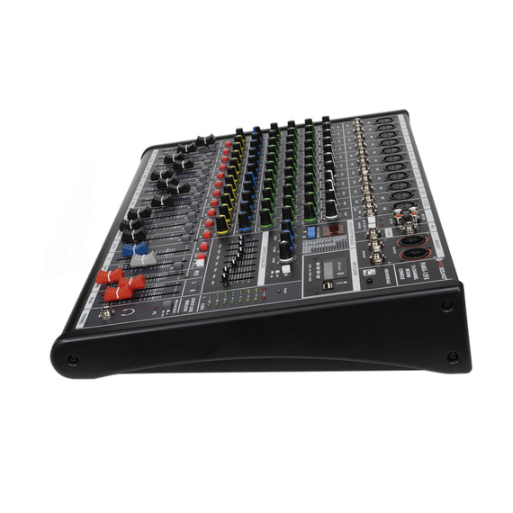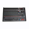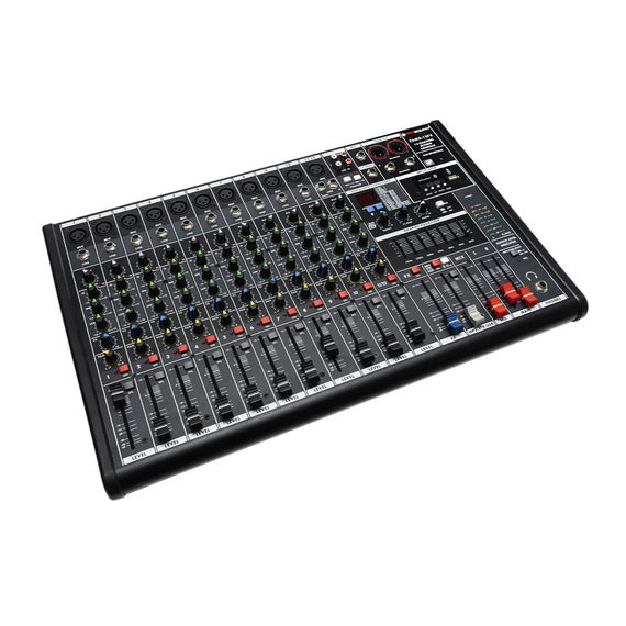 Mezcladora de 12 canales, con entrada mono y entrada stereo. Cada uno de los canales cuentan con boton de PFL. Entrada de microfono o linea. Ecualizador de 3 bandas, agudo. Medio y Grave. Paneo y fader en cada canal. Envío de efectos, y grabación stereo.