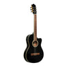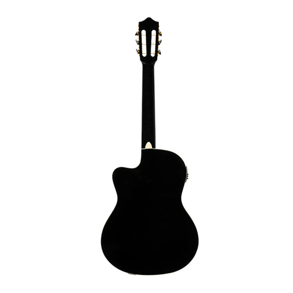 Guitarra electroacústica con cuerdas de nylon, formato 1/2 caja (75 mm de profundidad). Construida con tapa de spruce (abeto), aros y fondo de okoumé y diapasón y puente de nogal. Su mástil es de nato y contiene un alma regulable de acero, detalle muy interesante para el rango de precio de la guitarra. El preamplificador incluye afinador y controles de volumen, presencia, graves, medios, agudos y conmutador de fase. Color negro con binding crema. Clavijero dorado. Terminación con laca brillante.