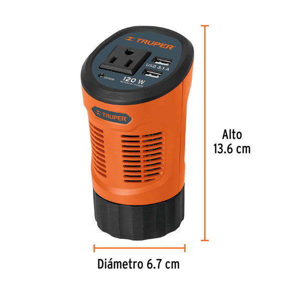 Inversor de corriente 120 w tipo vaso, 2 puertos usb.